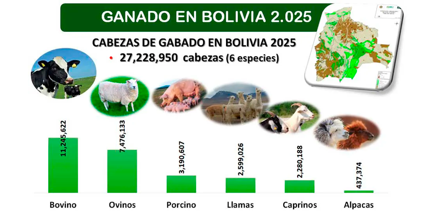 En Bolivia, en la presente campaña agrícola 2024-2025 se tiene 4.572.582 hectáreas sembradas y se espera generar 21.575.211 toneladas de 74 cultivares de producción en Bolivia. En el tema Ganadero, como la carne y derivados para el consumo familiar, se tiene 27.228.950 cabezas de ganado, así como 262.247.286 pollos, principalmente parrilleros, de acuerdo con el análisis del investigador de la UMSA.