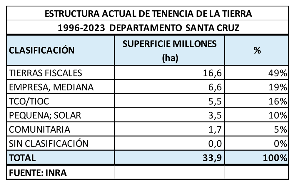 Un informe presentado por el INRA indica que a 2023, el 19% es propiedad medina y empresarial, pequeña 10%, haciendo un total de 29% de área titulada en manos de productores agropecuarios.