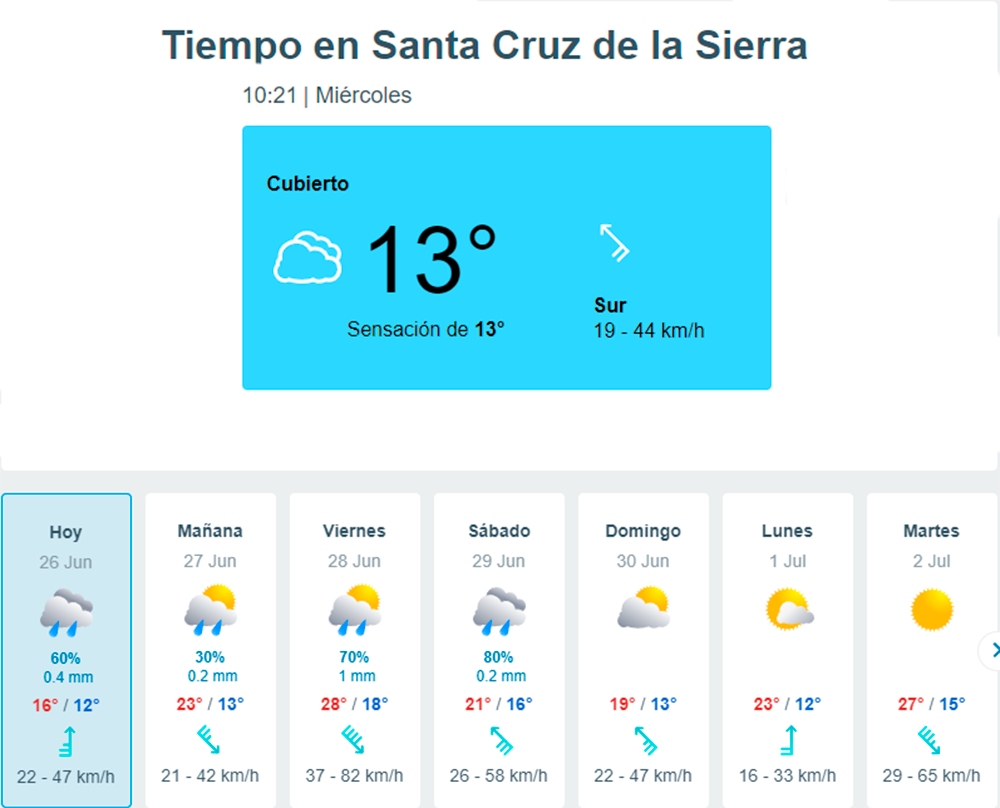 Con un cielo poco nuboso, Santa Cruz de la Sierra registra una temperatura mínima de 13°C este miércoles. Sin embargo, se espera que la máxima llegue a los 21°C, durante la jornada.